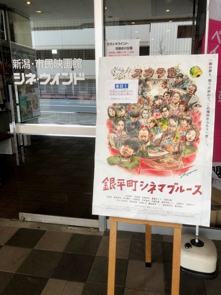 当日は粉雪が舞う寒さ厳しい日。果たしてお客様は!?と不安なまま開場しましたが、不安を吹き飛ばす人数の入場になりました。そしてゲストのお二人も新潟に到着。寒さに少し驚いたご様子でしたが入場状況に安心されたご様子。そのまま劇場にご案内して上映終了をお待ちいただきました。