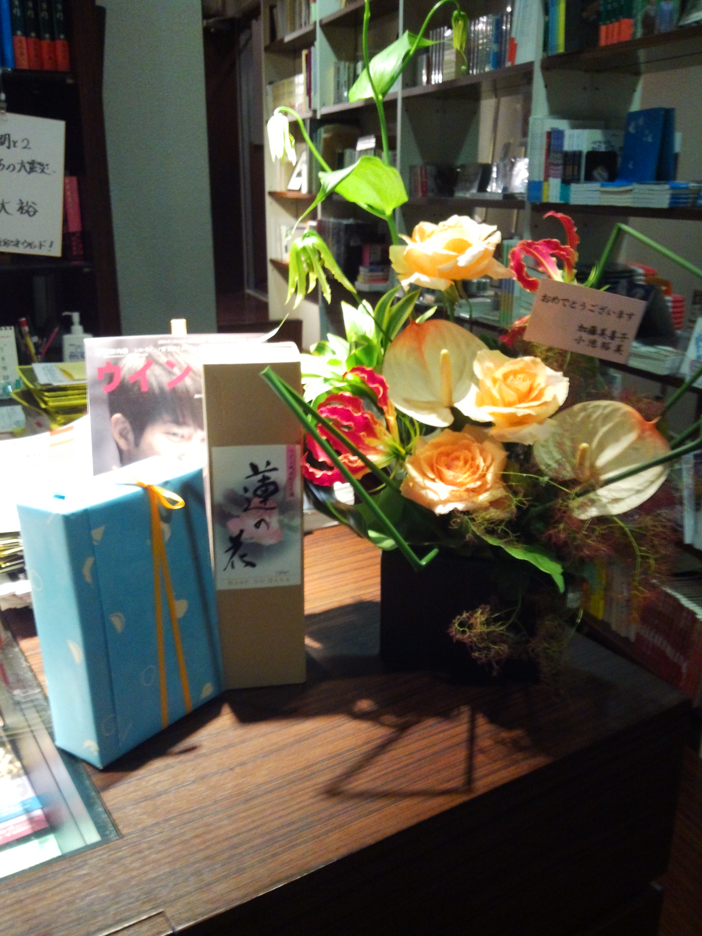 お祝いにお花やお酒やお菓子を頂きました。ありがとうございます。