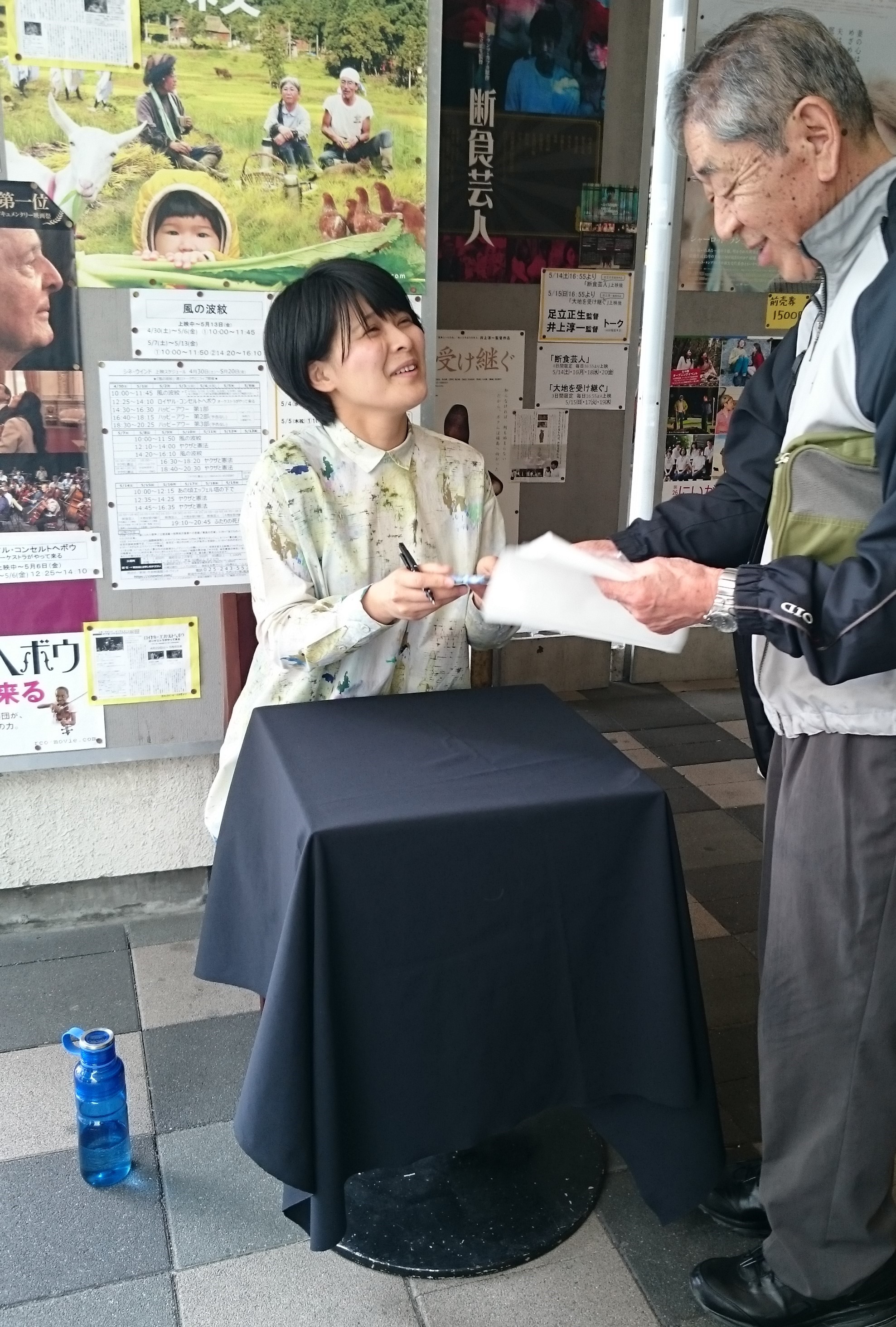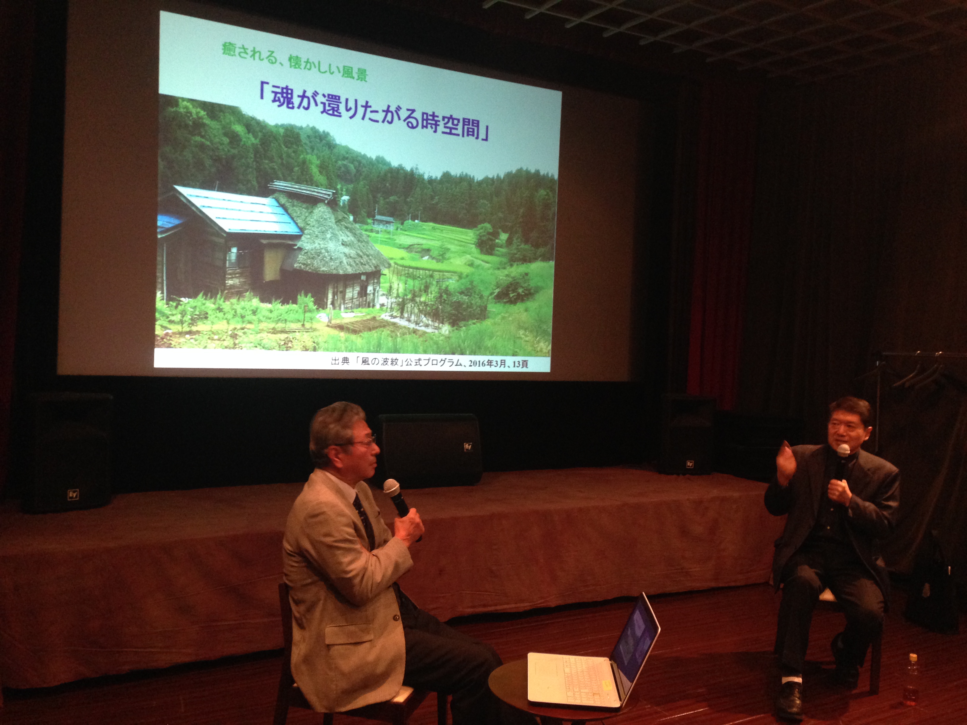 白状しますが、私(支配人井上)はプロジェクターやマイクの調整や写真撮影など「ぱんぱかぱん状態」で今日のトークに立ち会っており、小林監督と大熊さんの話のコアになる部分の記憶は甚だ怪しいのです。けれども、日本人の自然に対する思想とは本来「身近な自然に還ること」ではという考察や、『風の波紋』で描かれる風景について“魂が還りたがる風景”であるという指摘には大いにうなずきました。今日劇場にお越しになったお客様には『阿賀に生きる』関係者や【水と土の芸術祭】プロジェクトスタッフとしてお見かけした方の姿もあり、『風の波紋』で描かれた風景と『阿賀に生きる』の世界そして【みずつち】の趣旨との共通項も見出していただけたのではと思っています。