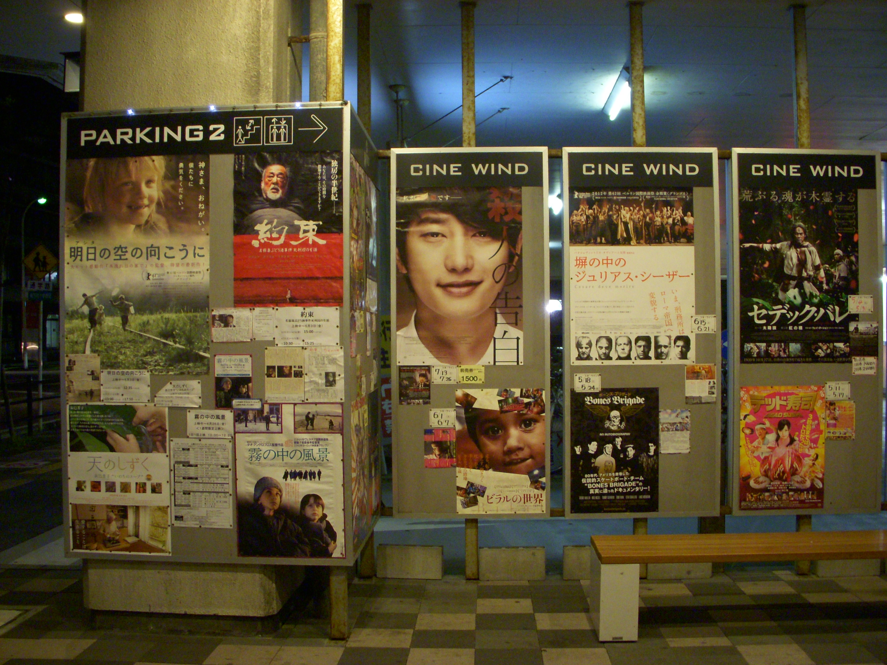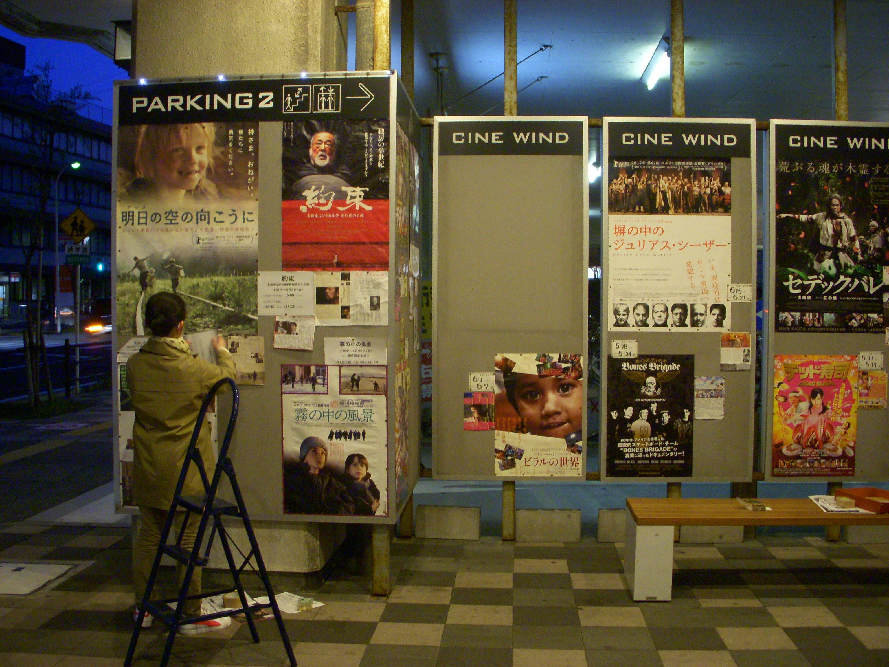 ちなみに、これらポスターの位置ですが、上の写真でAさんが貼り替え作業している1面が“今週上映中の作品”が貼ってある面で、あと他の面は“近日上映の作品”を貼る面なのです。
