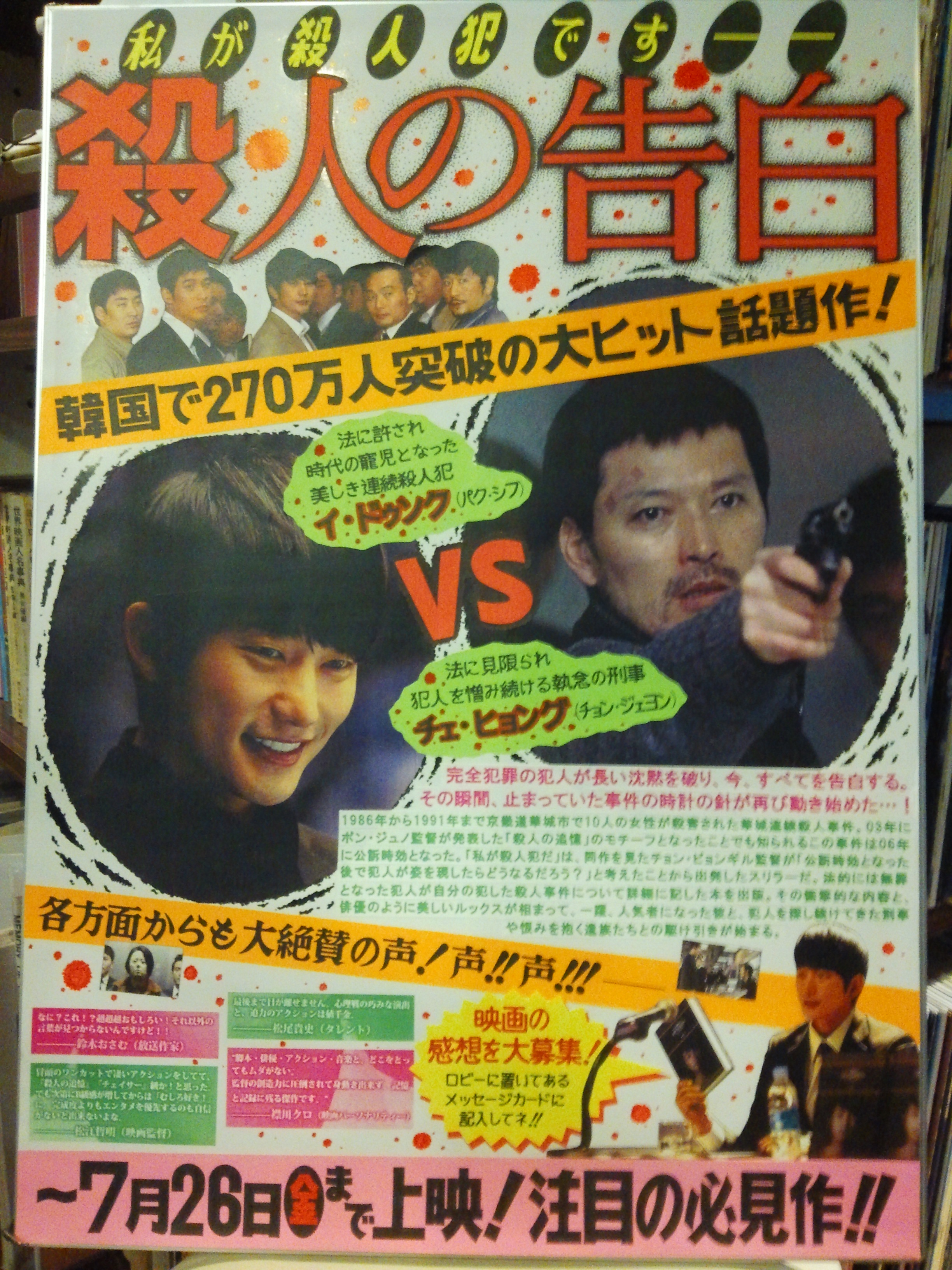 「殺人の告白」では、鑑賞するお客様にメッセージカードを配布いたします。これはパク・シフさんファンの方の持ち込み企画で、シネ・ウインドボランティアスタッフのIさんが製作してくれたものです。