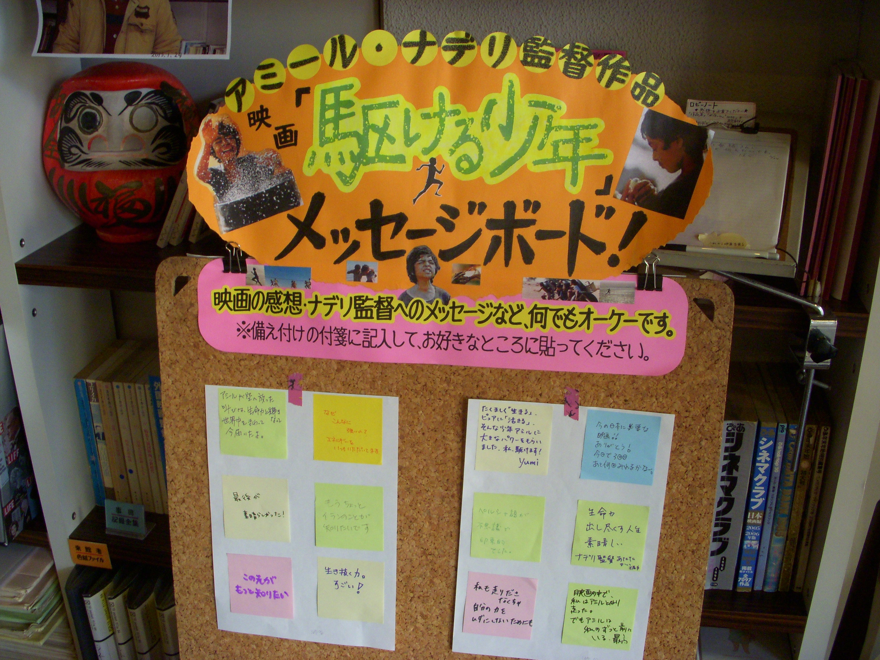 「駆ける少年」のメッセージボードがウインドのロビーに設置してあります。 観た感想などをポストイットに書いて貼りましょう!