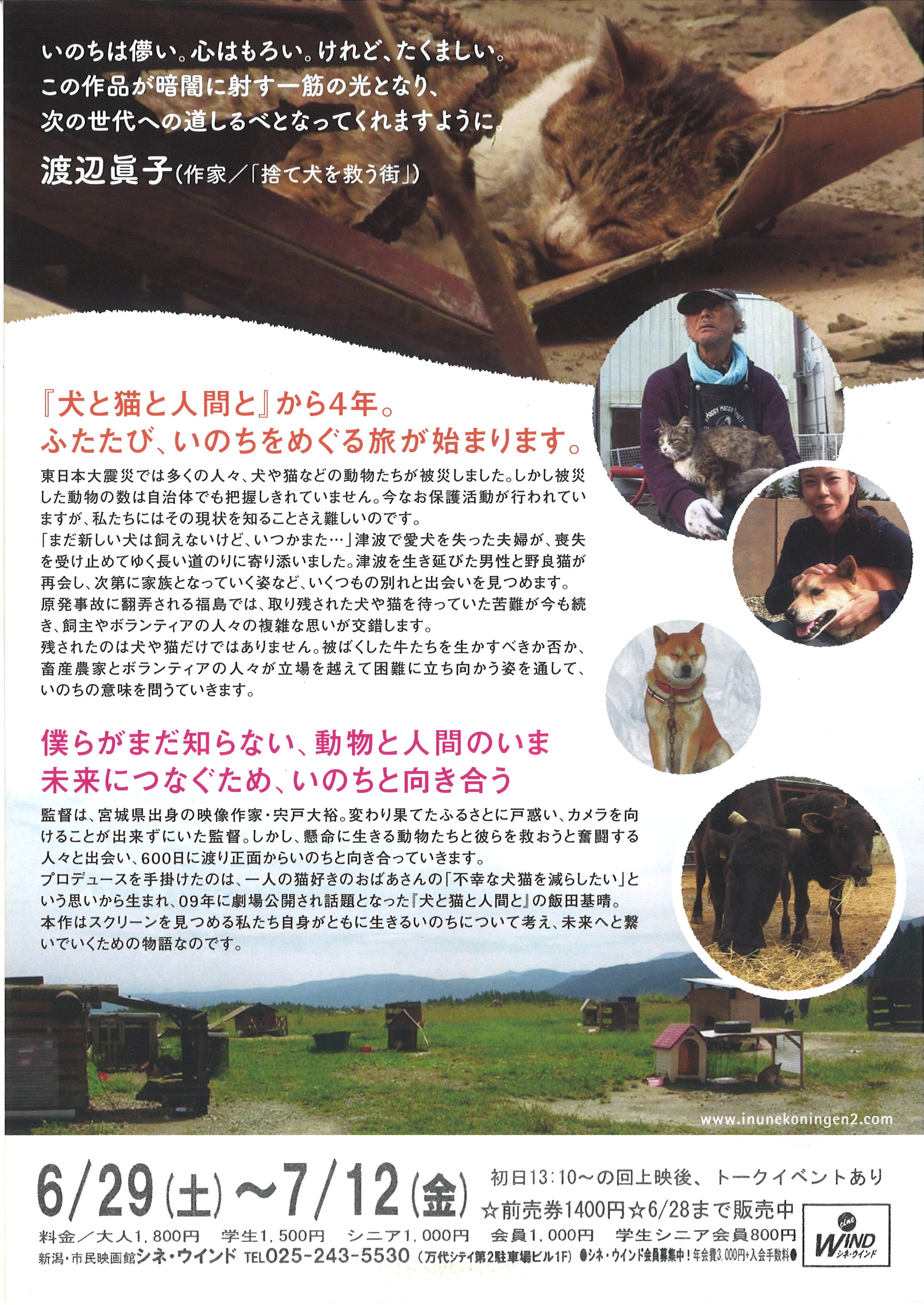 今日は前売券の納品に行ってきましたので、「殺人の告白」と「犬と猫と人間と2 動物たちの大震災」の2種類、シネ・ウインドのプレイガイドでもお取扱い始まりました。