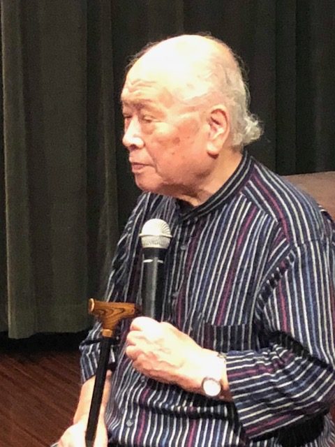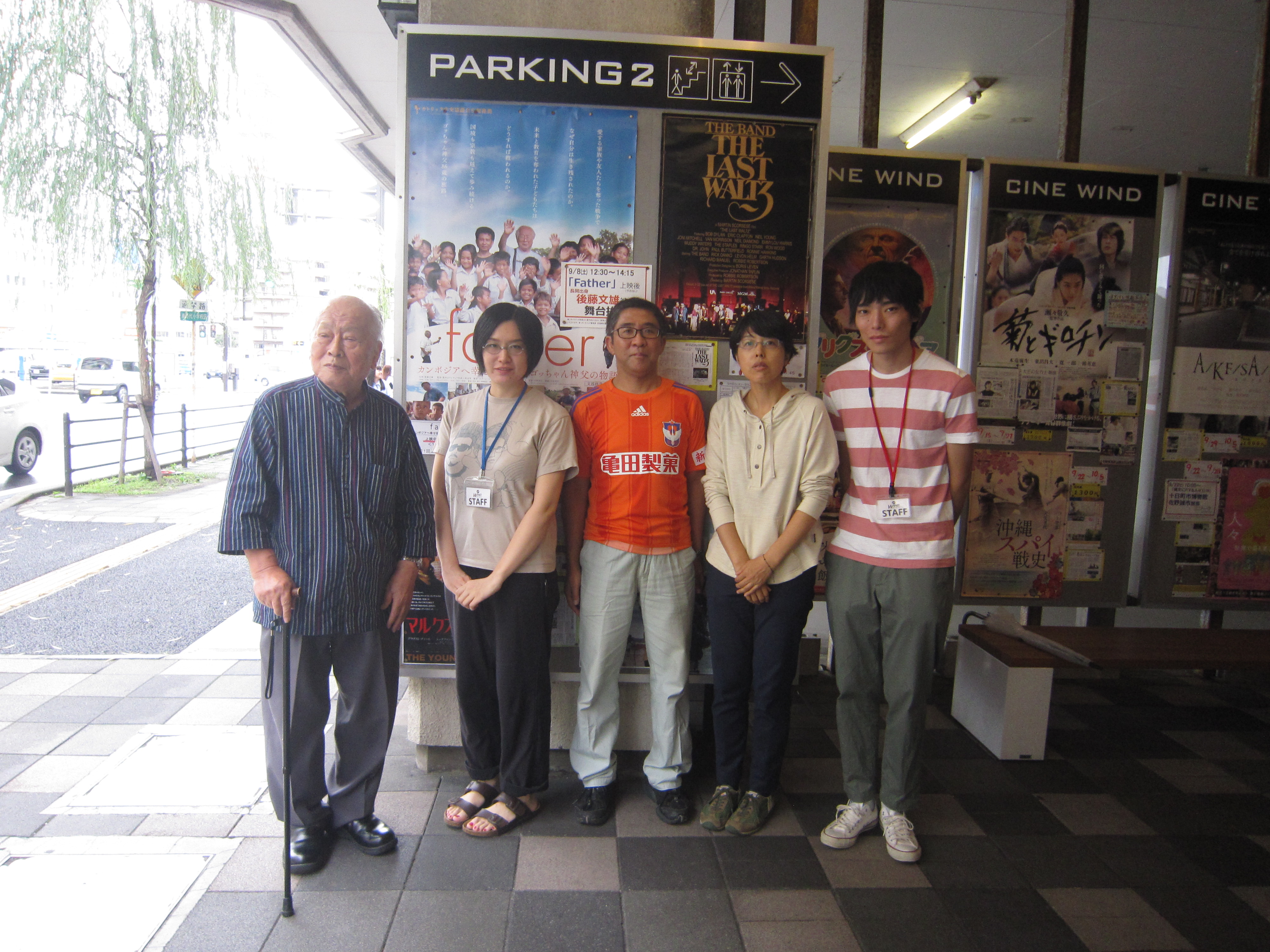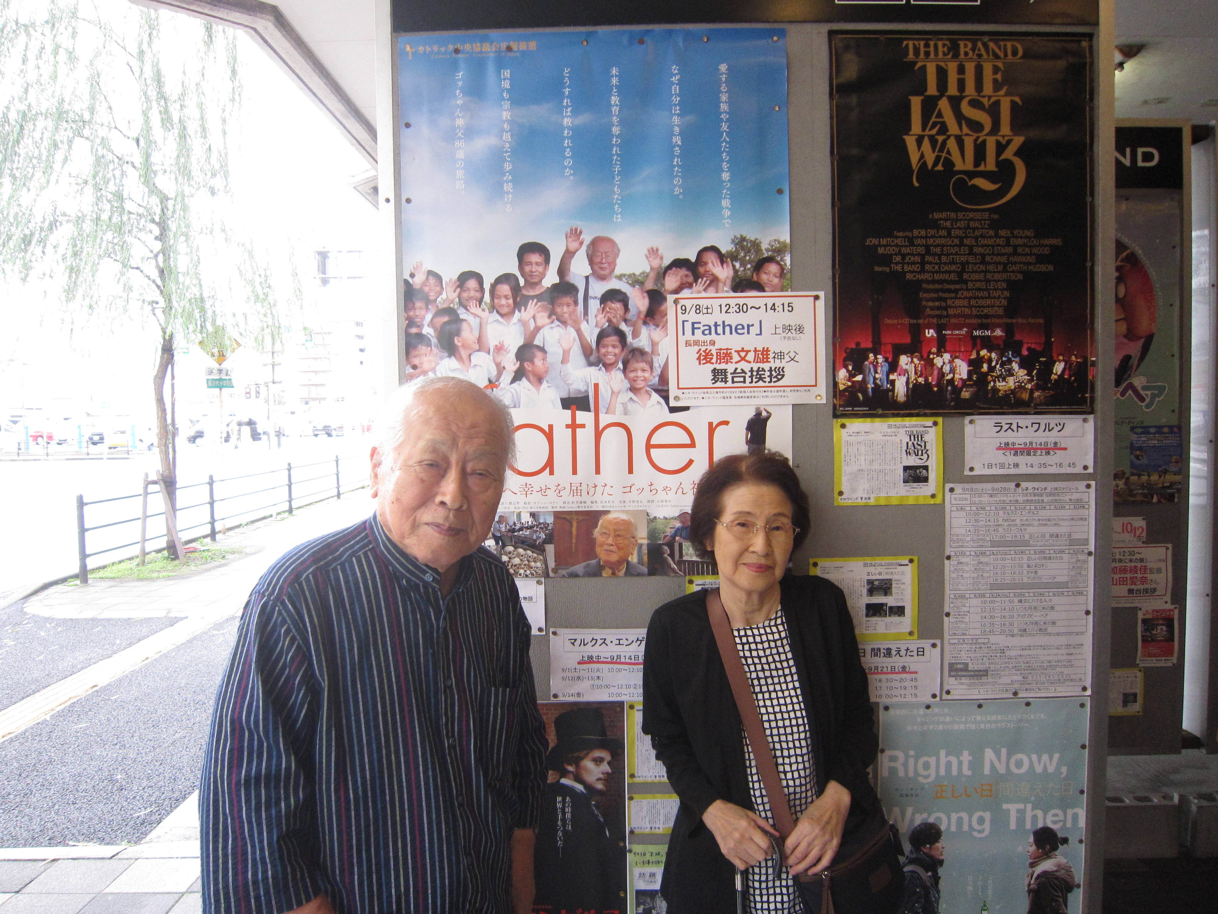 上映後に待望の後藤神父の舞台あいさつとなりましたが、なんと街なかで「father」ポスターを見てお越しになった後藤神父の小学生時代の同級生が来館。実に83年ぶりの再会に場内は拍手喝采でした。そして後藤神父のお話。その考えの根底にあるのは、世界平和への心からの願いだったと確信しました。カンボジアから来た難民たちと出会い、彼らの里親になったこと。彼らの求めに応じ19もの小学校をカンボジアに設立したこと。そして話の最後には、終戦直前に長岡に落とされた模擬原爆「パンプキン」を引用しながら平和の大切さを訴えました。後藤神父の平和愛と新潟愛に、ちょっと感動した舞台あいさつでした。
