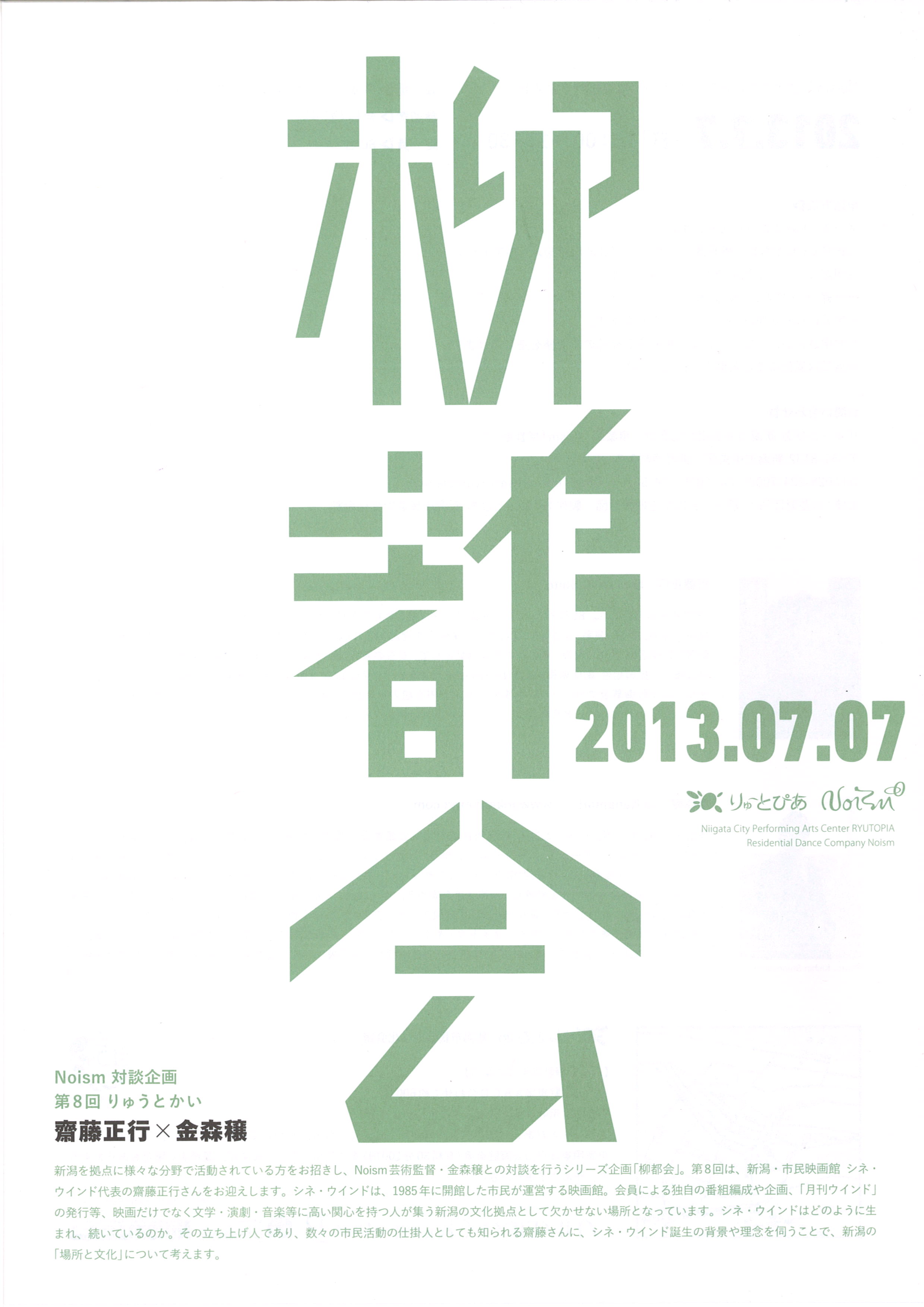 ブログ 新着情報 シネ・ウインド日記 2013年7月7日 柳都会,不思議でステキなトークでした Noism金森穣さんとシネ・ウインド齋藤の対談企画、柳都会に行ってきました。 りゅーとぴあのスタジオに入りますと、黒いソファーが対面で置いてありまして、 四方に客席が設けられていました。 おおーっ、立派~!!かっこいいわ …