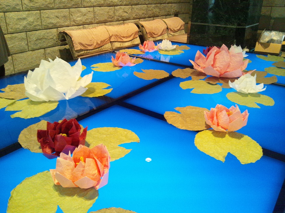 受付でいただいた睡蓮の折り紙飾り(写真)を胸につけ、わくわく気分で開場式へ。