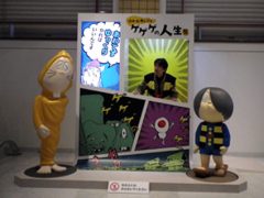 写真右上のコマ部分に入るとセンサーが反応し、左上のコマ部分に水木さんの名言とイラストがランダムに表示されます。