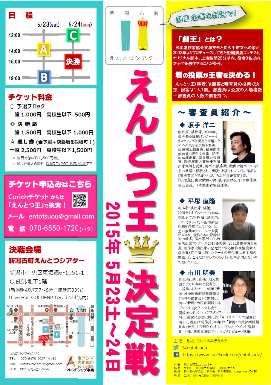 (新潟市中央区東堀通6-1051-1 G.EビルBF 電話:070-6479-2927 メール:entotsutheater@gmail.com URL:http:えんとつ.com/)