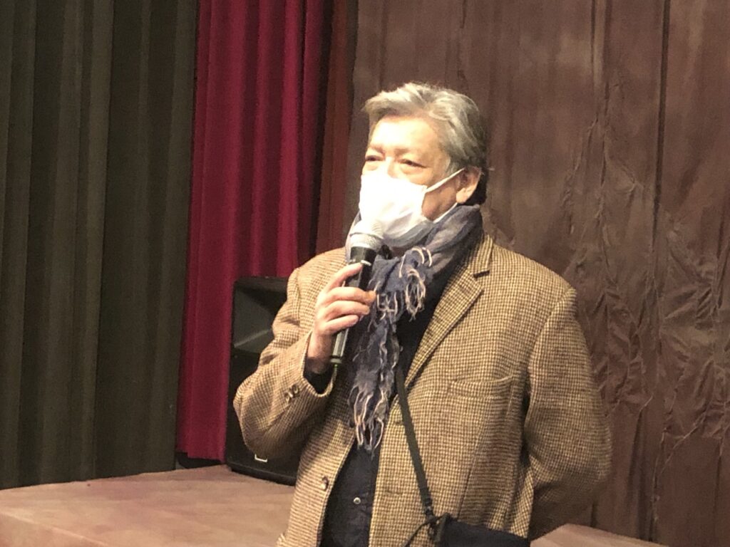 小林プロデューサーは、まずこの映画は小説を題材にしたフィクションであること話し、ドメスティックバイオレンスを賛美する映画では全くないと強調しました。続いて当時日本で活躍していた詩人の多くが戦争を賛美?する詩を残していたことに触れ、「萩原朔太郎も三好達治も単なる戦争被害者ではない、積極的に日中戦争そして太平洋戦争に関ったことを忘れてはいけない」と話したことが印象に残りました。