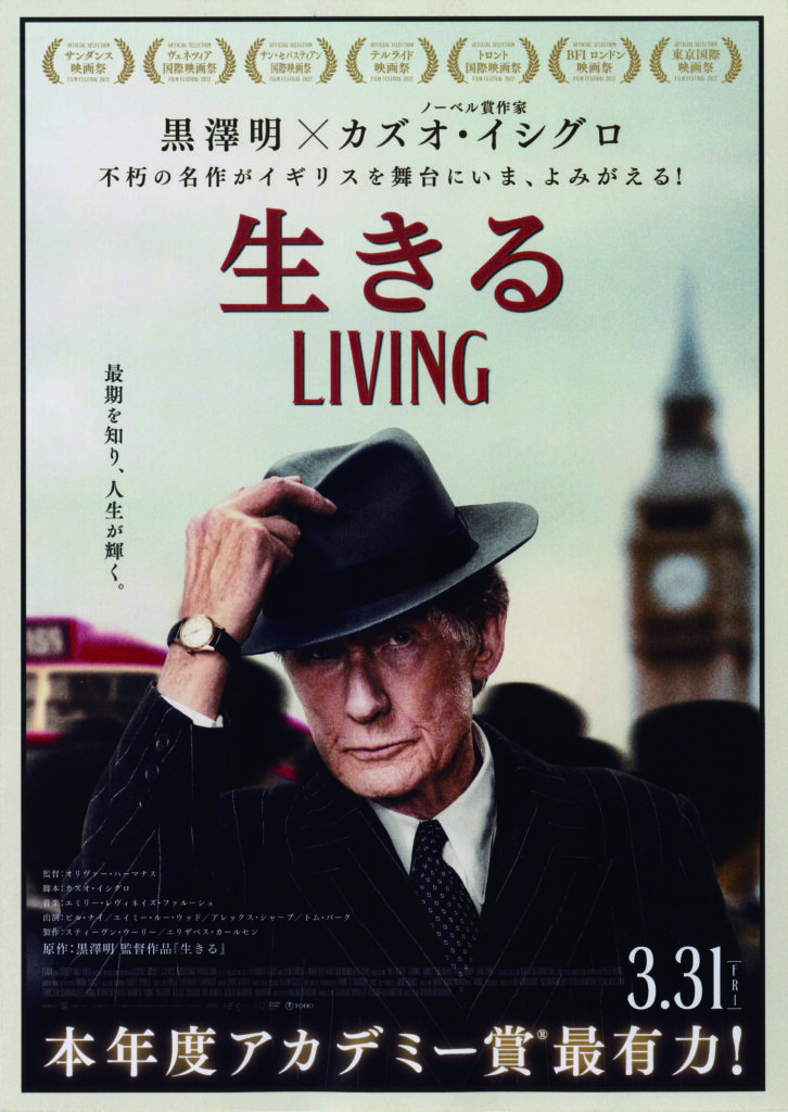 黒澤明の不朽の名作『生きる』(1952年)を原作として、ノーベル賞作家カズオ・イシグロが第二次世界大戦後のイギリスを舞台に変えて脚本化した映画『生きる LIVING』。今春シネマコンプレックスさんで上映され、映画ファンの間で話題となった名作です。当館ボランティアスタッフのなかでも話題になった本作、まだまだ未見かつ必要な方がいるのではという思いで、当館での夏休み上映を決めました。