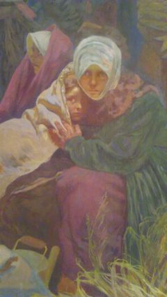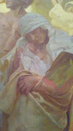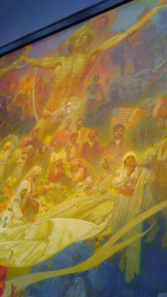 もちろん会場内はかなり混み合ってはいたが、なにせ「スラブ叙事詩」はそれぞれの作品が大きいので、離れないと全体が見られないため、作品の前は意外に空いている。前景を近くでじっくり見て、離れて全体を眺めてと、けっこうしっかり見られて良かった。写真OKのエリアもあり、せっかくなので「子どもを抱く女性」をアップで撮ってみたりした。アール・ヌーボーの作品は普通のサイズ(笑)なので、人の陰になってあまりよく見られないものもあったが、お目当の「スラブ叙事詩」を堪能できたので、行ったかいがあった。