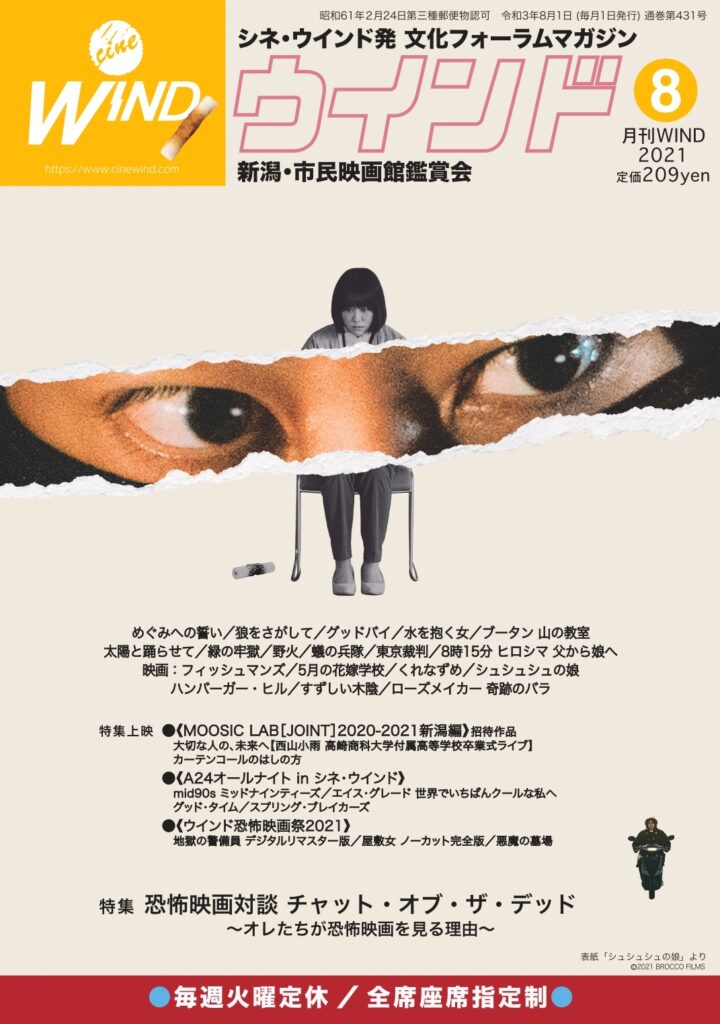「めぐみへの誓い」「狼をさがして」《MOOSIC LAB[JOINT]招待作品》《A24オールナイト in シネ・ウインド》「グッドバイ」「水を抱く女」「ブータン 山の教室」「緑の牢獄」「太陽と踊らせて」「8時15分 ヒロシマ 父から娘へ」「映画:フィッシュマンズ」「5月の花嫁学校」「野火」「蟻の兵隊」「東京裁判」「くれなずめ」「シュシュシュの娘」《ウインド恐怖映画祭2021》「すずしい木陰」「ハンバーガー・ヒル」「ローズメイカー 奇跡のバラ」
