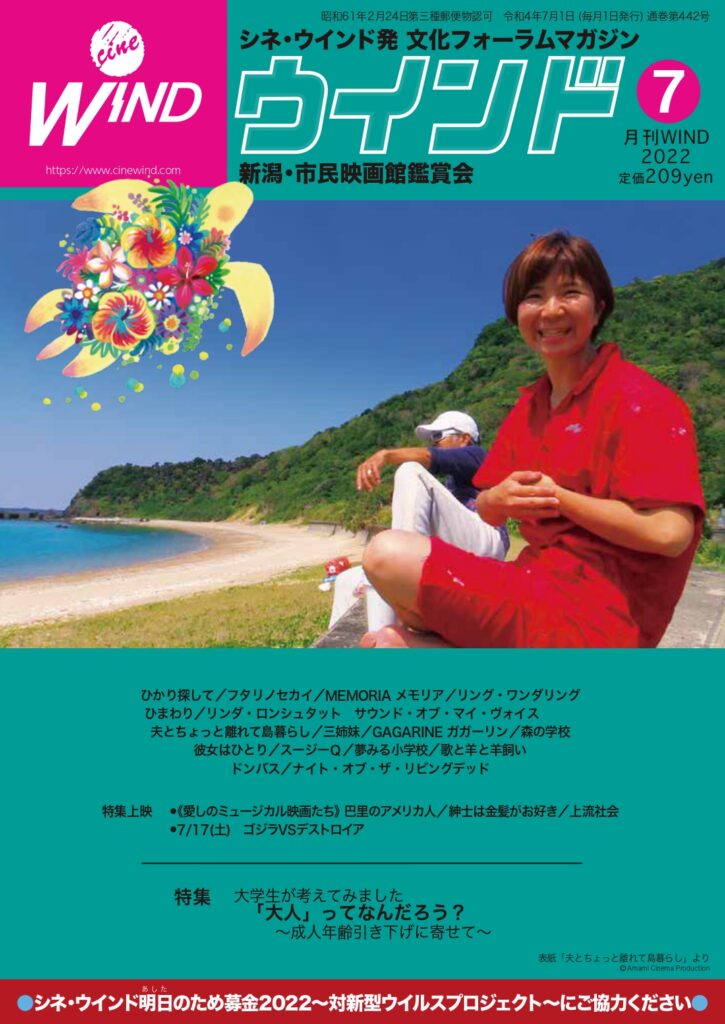 表紙は人気イラストレーター・ちゃずの島暮らしドキュメンタリー「夫とちょっと離れて島暮らし」(7/9~15上映 ※火曜休館)。2014年、出演作「アイドル・イズ・デッド ノンちゃんのプロパガンダ大作戦」「サッドティー」上映に際してシネ・ウインドに来館してくださった俳優・國武綾さんの初監督作品。舞台は日本最後の楽園と呼ばれ、手つかずの自然が残る奄美群島の加計呂麻島(「男はつらいよ 寅次郎紅の花」の舞台にもなった島)。ぜひ映画館のスクリーンでご覧ください!
