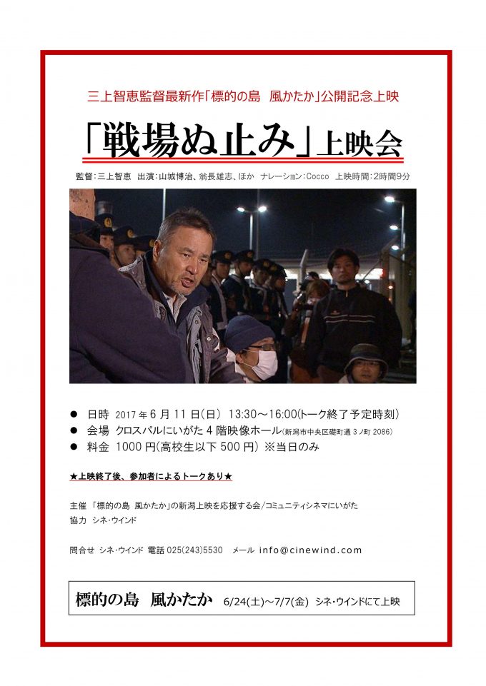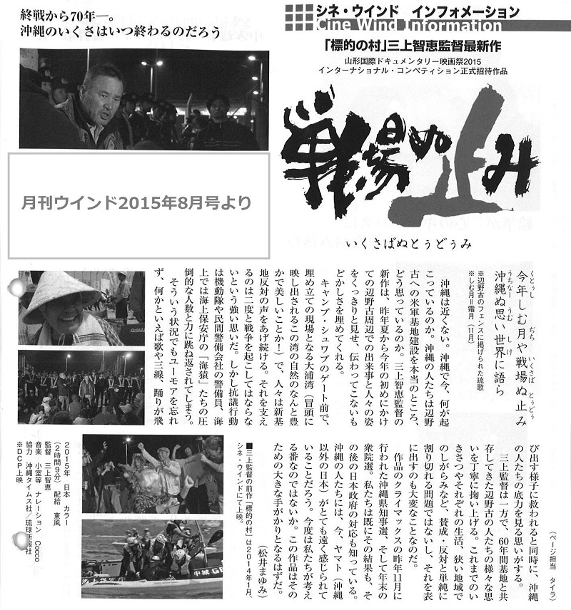 「戦場ぬ止み」6/11(日)クロスパルで上映会 2017年5月5日 2017年5月7日 シネ・ウインド 「標的の島 風かたか」6/24(土)~7/7(金)公開を記念して、三上智恵監督の前作「戦場ぬ止み」の上映会を行います。