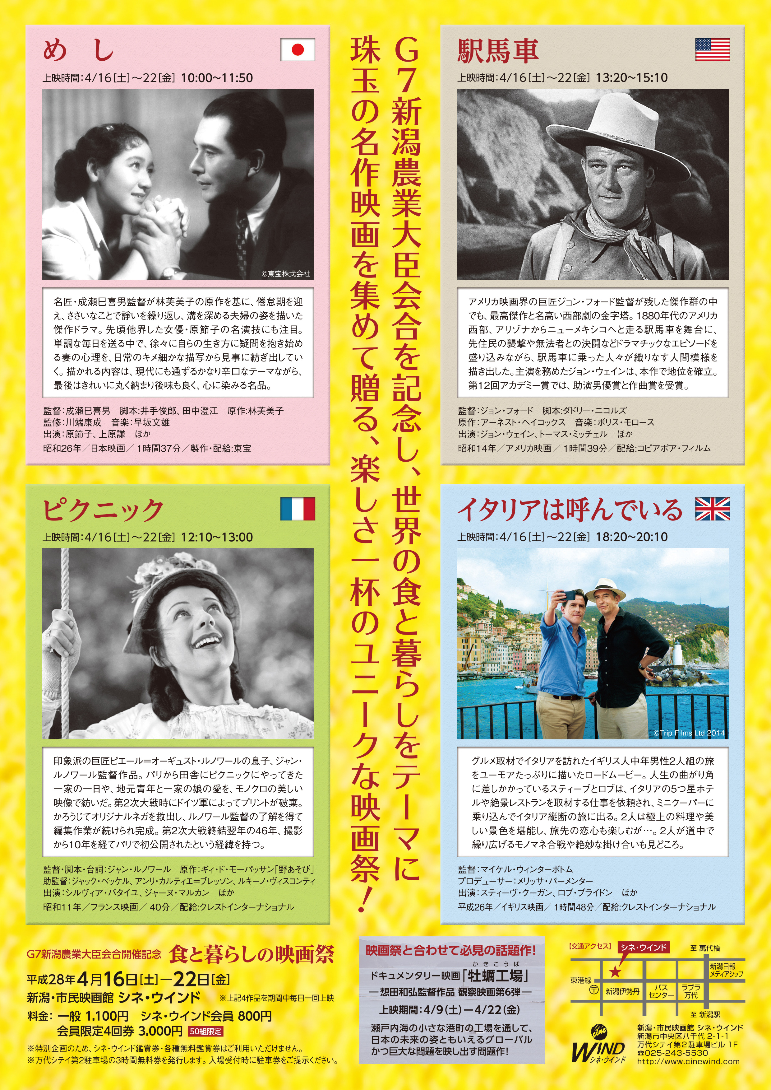 問合せ:食と暮らしの映画祭実行委員会(シネ・ウインド内) 025-243-5530 foodmovie_niigata@yahoo.co.jp