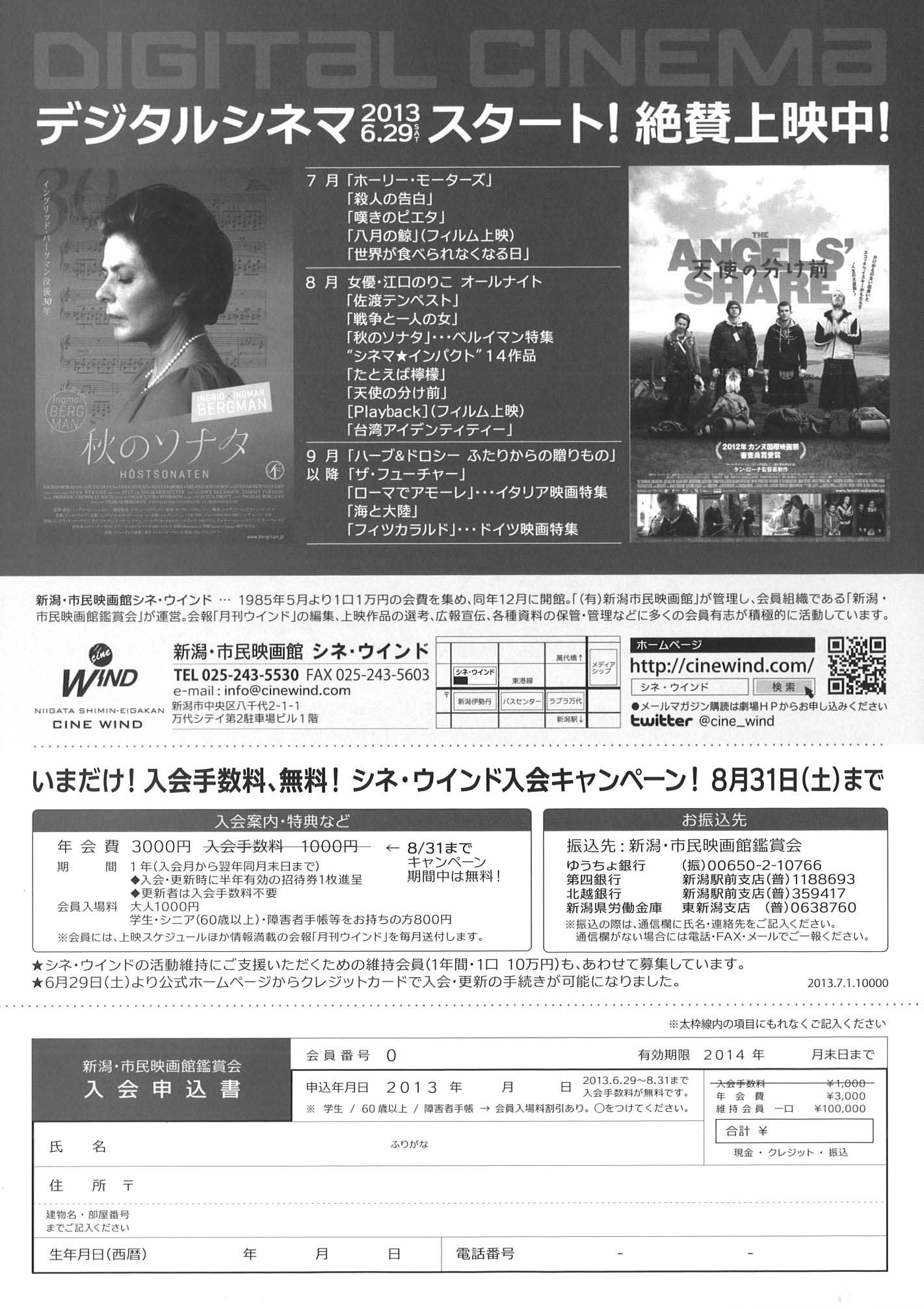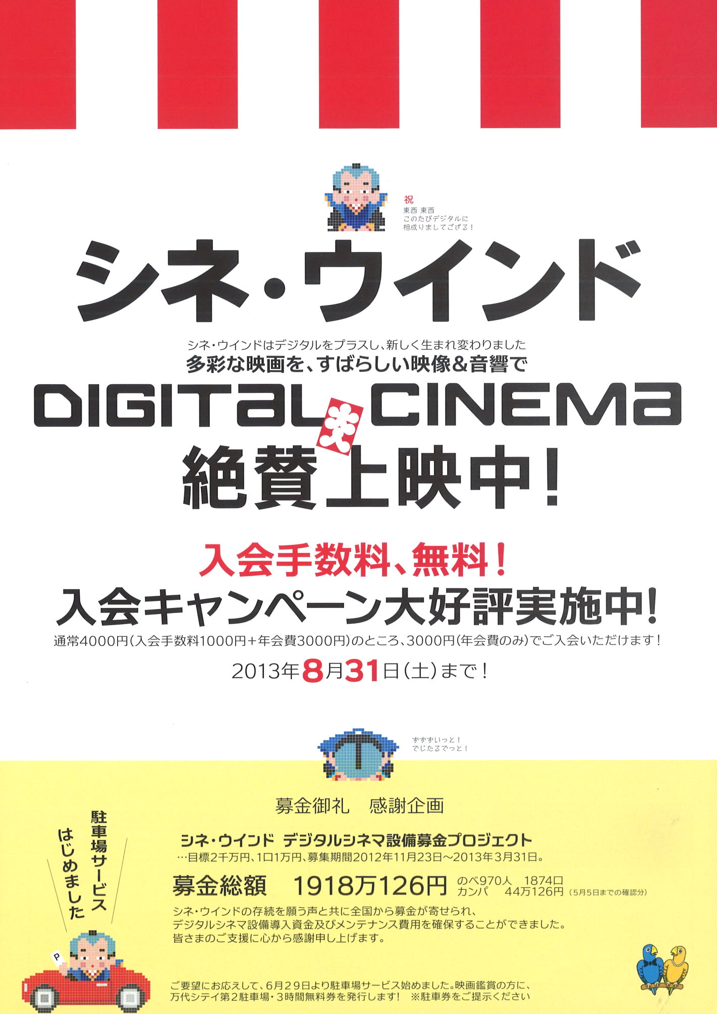 シネ・ウインドでは通常1000円の入会手数料が無料になる、入会キャンペーンを実施中です お申し込みは、新規会員申込フォーム もしくは、シネ・ウインド受付まで。 デジタルシネマ募金感謝企画として、8/31までの期間限定! この機会にぜひご入会下さい