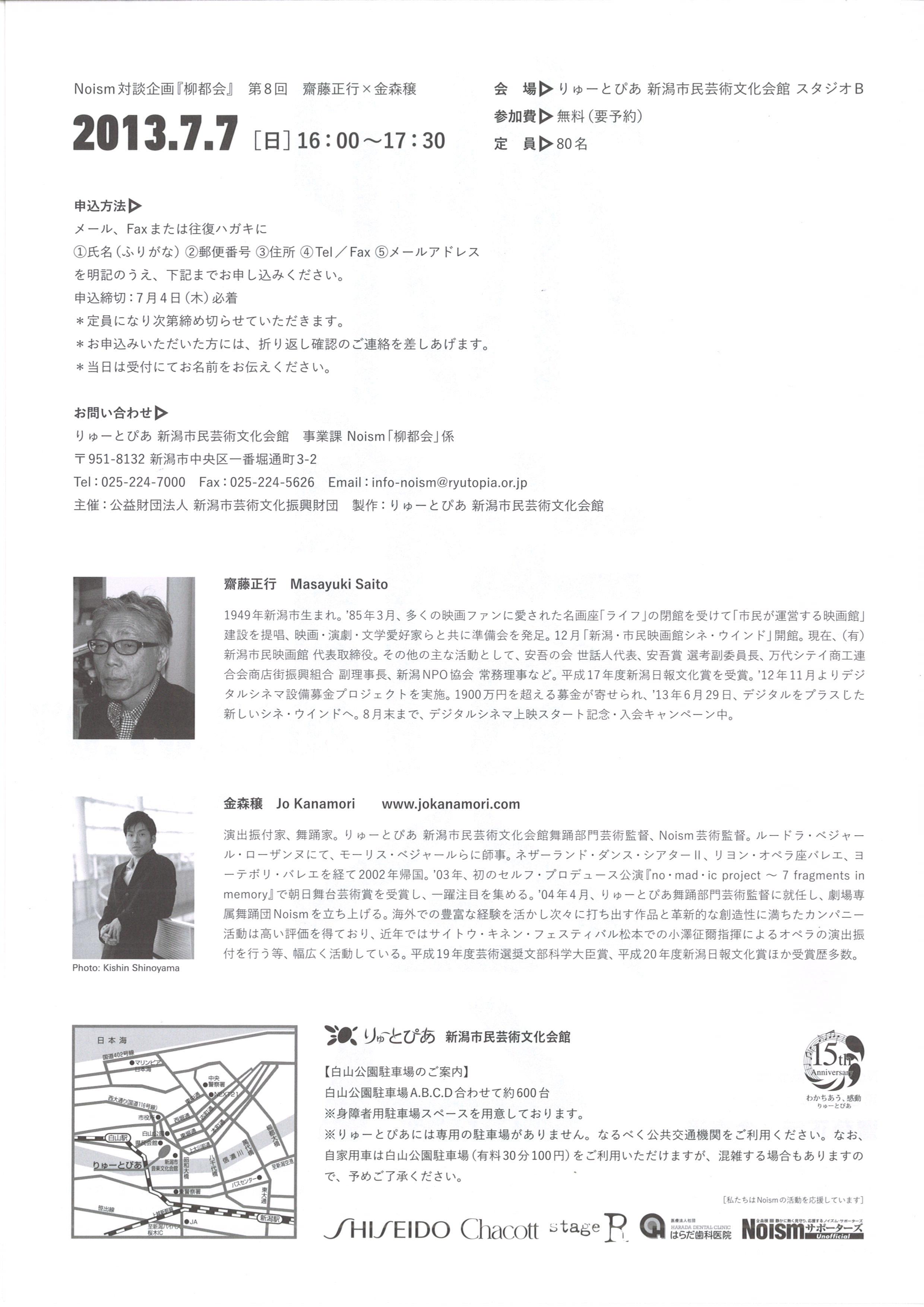 Noism芸術監督・金森譲さんが対談を行うシリーズ企画「柳都会」の第8回ゲストとして、新潟・市民映画館 シネ・ウインド代表・齋藤正行をお招きいただきました。 2013年7月7日(日)、会場はりゅーとぴあ。 参加費は無料ですが、要予約とのこと。 詳しくはNoismホームページをご覧ください→ http://www.noism.jp/news/2013/05/noism-8-1.html みなさまご参加ください。