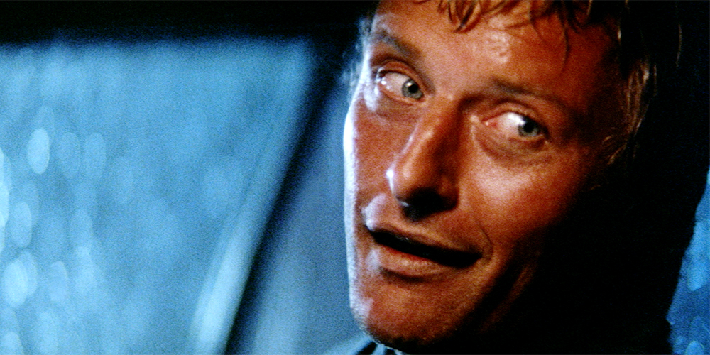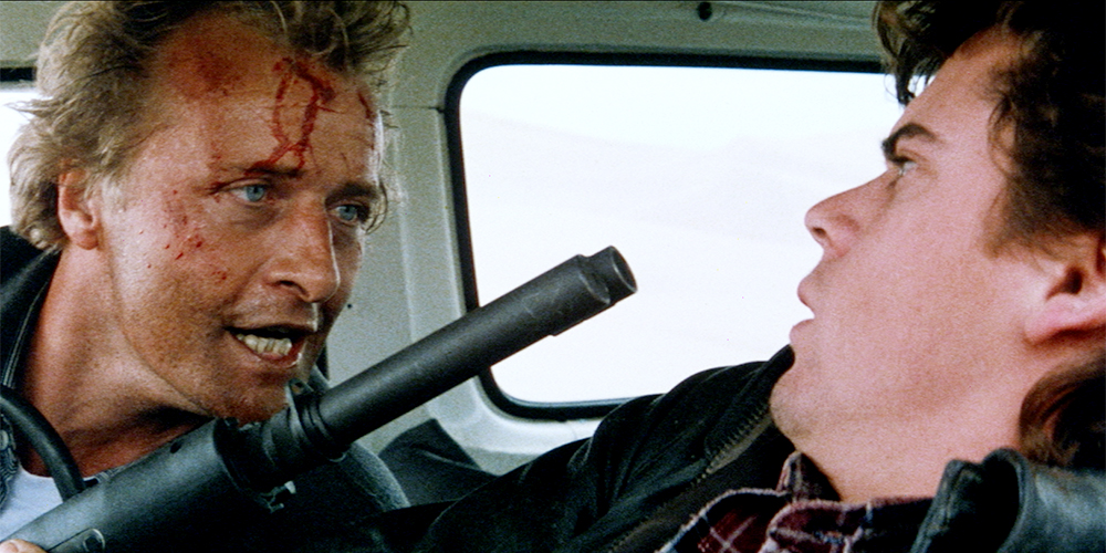 テキサスの砂漠地帯で車を走らせる若者が、ひとりのヒッチハイカーを拾ってやる。助手席に座らせたその男はナイフの刃を首筋にあててきて「俺を止めろ」と言ってくる。「車を走らせろ。死にたいと言え」と脅してくる。男と男の、妙な因縁が始まりますね。このヒッチハイカーは何なのか。主人公の若者にまとわりつき、追い詰め、苦しめる。平然と人を殺すような凶悪犯なんですね。残忍で、空虚で、謎めいていて、まるで幽霊のような、奇妙なシリアルキラー。1950年代にアメリカで実在したヒッチハイカーの連続殺人鬼が基になっていますが、脚本のエリック・レッドと演じたルトガー・ハウアーは、このいかにも映画的な悪役を、映画の中でこそ邪悪に活かしました。若者を苦しめるためにふっと現れて悪さをし、去っていく。誰を巻き添えにしようと構わない。警察に捕まろうがどうだっていい。ただ苦しめてやる。この嫌らしさ、恐ろしくも、もう目が離せない。これが映画の悪役。映画の凶悪犯。「ダークヒーロー」という言い方はあまり好きではありませんが、そのミステリアスで邪悪な存在感をもって主役を喰いましたね。若者はこのヒッチハイカーによる恐怖と苦しみのあまり、銃で自殺することも考えた。でも出来なかった。そしてさらに悲惨な目に遭う。この世の地獄。ここで苦しみ抜いて殺されるのか。それとも、どうしてやるか。
