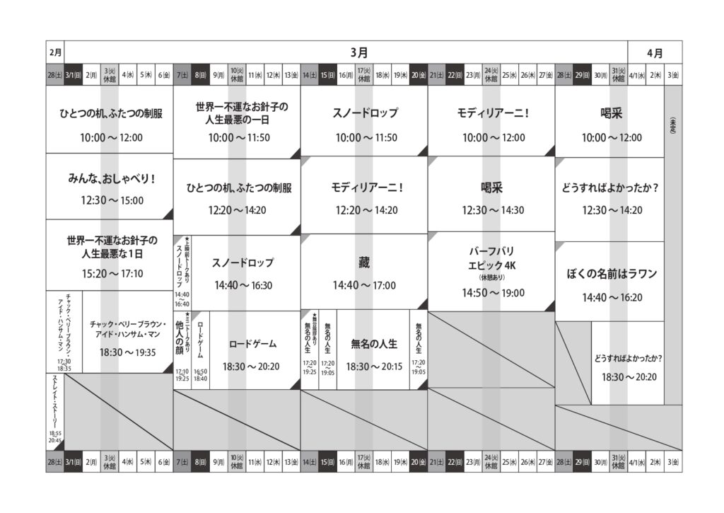 無名の人生 3/14~3/20 3/15 日 17:20 ~ 19:05 3/16 月 18:30 ~ 20:15 3/18 水 18:30 ~ 20:15 3/19 木 18:30 ~ 20:15 3/20 金 17:20 ~ 19:05 チケット購入はこちら