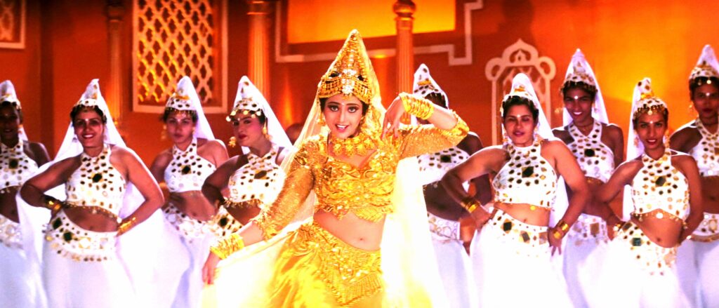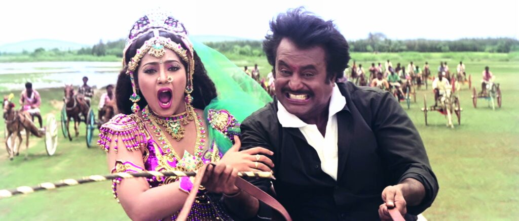 これはもう、想像を絶するデザインのソング&ダンスシーンです。空想の中で、恋愛感情の高まったムトゥとランガが舞い踊る、というシーンなのですが、6回も衣装とセットの色が変わるのです。オレンジ、緑、青、黄、黒、赤とメインカラーが変わり、細部のいろんなカラーリングも見事に変わります。よく見ると、登場するオブジェのあれこれもよく考えてあり、こういうコンセプトを考える美術監督ってすごいなあ、と思ってしまいます。誰だったんでしょう? 4K&ステレオでしかも大画面、超インパクトがありますよ~。