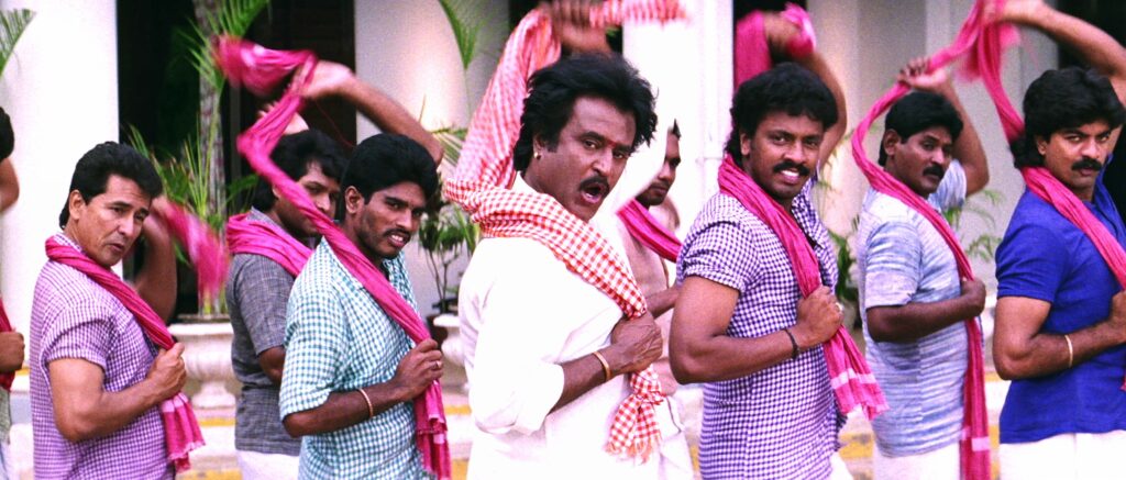 ”スーパースター”ラジニカーントの作品には、冒頭に必ずと言っていいほど、主人公を紹介する歌が出て来ます。私はこれを”お名乗りソング”と呼んでいるのですが、主人公がどういう人物か、外見を説明するというよりも、彼の信条、主義主張を歌いあげるソングなのです。『ムトゥ』のこの歌でも、主人公ムトゥの忠誠心(”主”は主人であり、時には神にも通じる表現です)や「運命に打ち克て」という人生観、そして金銭感覚なども歌い込まれて、「このおっさん、何者?」と思わせてくれます。ムトゥはこの時、馬車を駆っているのですが、途中でいろんな人が間奏部分に登場し、群舞シーンを繰り広げてくれます。