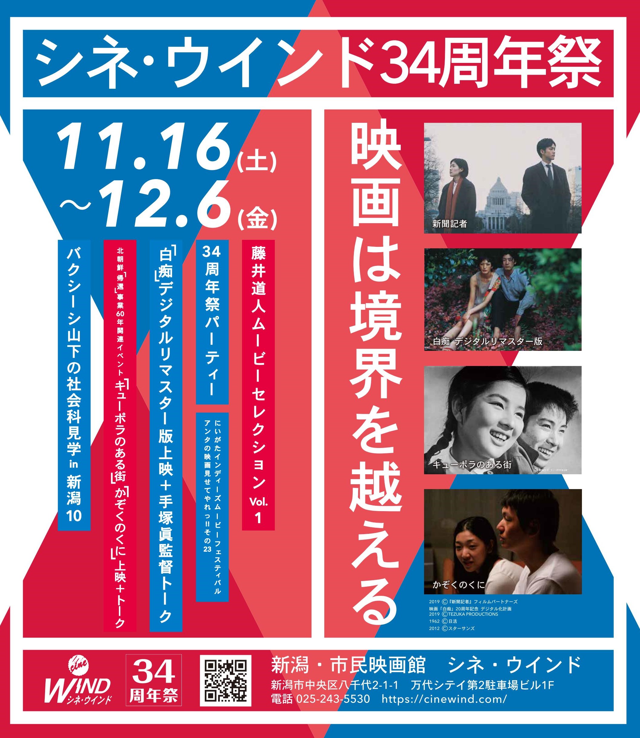 新着情報 12月7日 38周年祭 38年 シネ・ウインド 万代シテイ 周年祭 花咲く街の映画館 2023年12月3日 12/7(木)は38回目の開館記念日です シネ・ウインドはおかげさまで2023年12月7日で開館38年となります。 この日はサービスデー料金で映画をご鑑賞いただけます。シネ・ウインド会員900円/一般1200円 この日の上映は次の4作品です●10:00~11:4 …