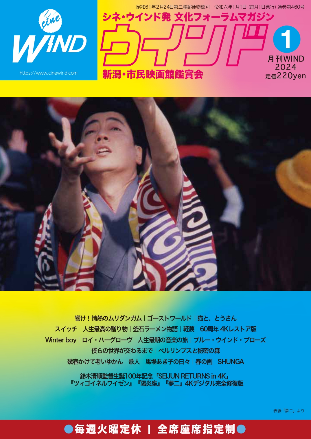 月刊ウインド SEIJUN RETURNS in 4K ジュリー ベストテン 周年祭 四コマ漫画 夢二 月刊ウインド 沢田研二 鈴木清順 風猫句会 2023年12月20日 月刊ウインド2024年1月号(460号)内容紹介 ABOUT 2024年1月1日発行|定価220円|B5判・16ページ 表紙は〈SEIJUN RETURNS in 4K〉から「夢二」です。 今号には2023年の新潟市内の上映作品リストが付録でつきます。リストの作成にあた …