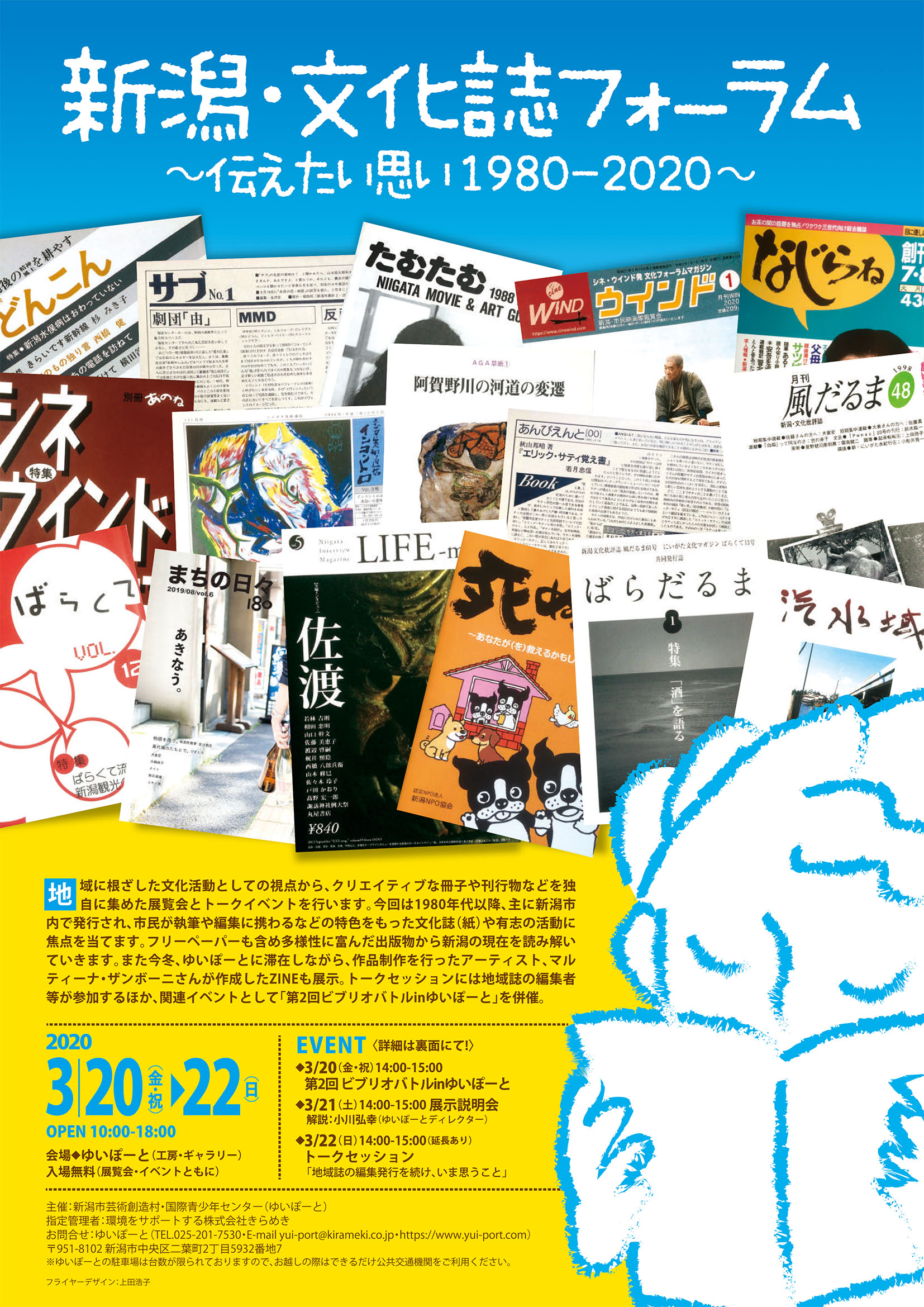 新着情報 ゆいぽーと 月刊ウインド 齋藤正行 2020年2月25日 【新潟・文化誌フォーラム】月刊ウインドが展示されます 3/20(金)~3/22(日) ゆいぽーとを会場に開催される新潟・文化誌フォーラム。 3/22(日)のトークセッションには当館代表の齋藤正行が登壇します。ぜひ足をお運びください。