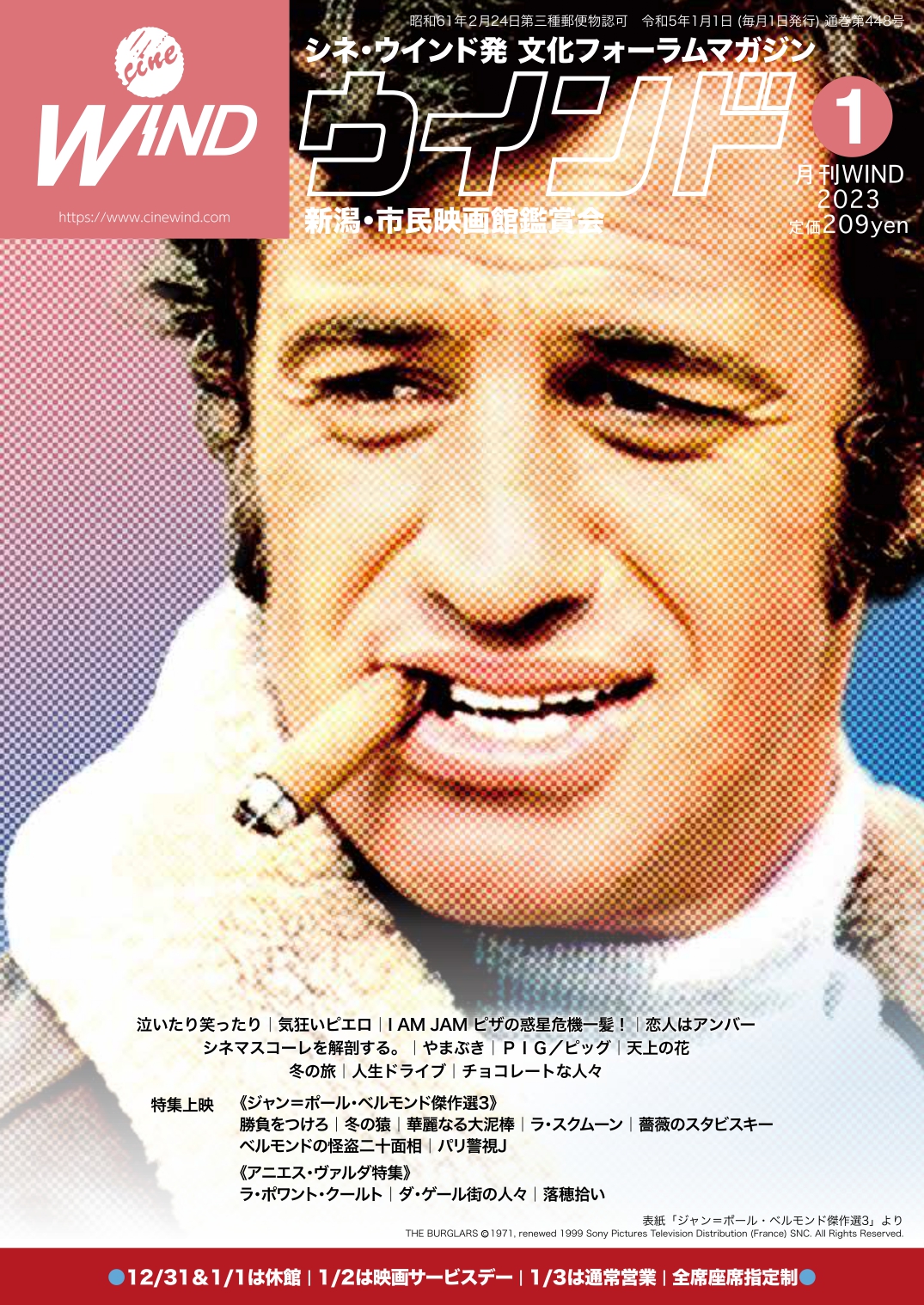 月刊ウインド 1月号 シネ・ウインド ジャン=ポール・ベルモンド 月刊ウインド 2022年12月29日 月刊ウインド2023年1月号(448号) 1月号表紙は「ジャン=ポール・ベルモンド傑作選3」(1/14~1/27上映 ※火曜休館)。 1月の上映作品の紹介&時間を掲載。(→上映スケジュール) 2023年1月1日発行定価 ¥190+税ネットショップでのご購入はこち …