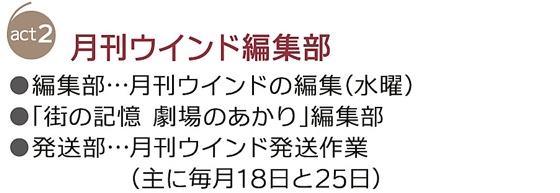 他にもチラシや広告を製作する「広告部」、ディスプレイや掲示物を担当する「楽日部(らくびーぶ)」、日本映画の魅力を発信する「PROJECT DOMO」など、たくさんのメンバーがシネ・ウインドの楽しさを創っています。
